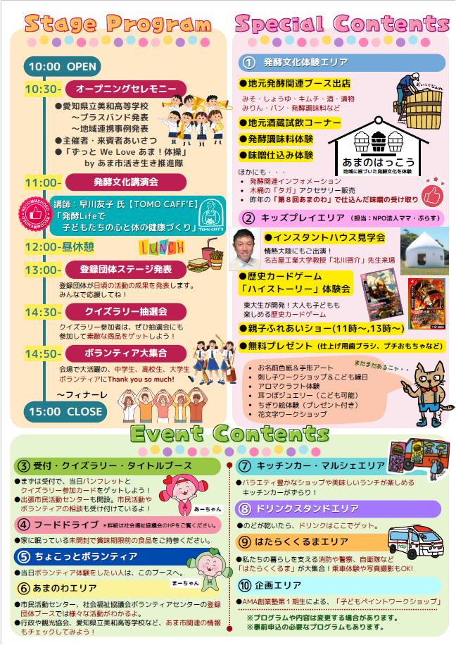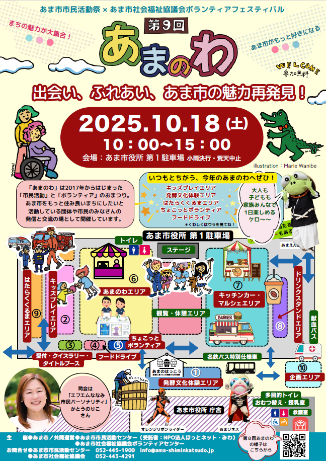 10月18日(土)に、あま市役所第一駐車場にて『第9回あまのわ』が開催されます!あま市をもっと住み良いまちにしたいと活動しているボランティア団体や市民のみなさんの発信と交流の場として行われています。キッズプレイエリアやはたらくくるまエリア等、子どもが楽しめるイベントもあります!この機会に是非、お越し下さい!詳しくは、下記のリンクからご覧下さい。>>詳細はこちら>>詳細はこちら